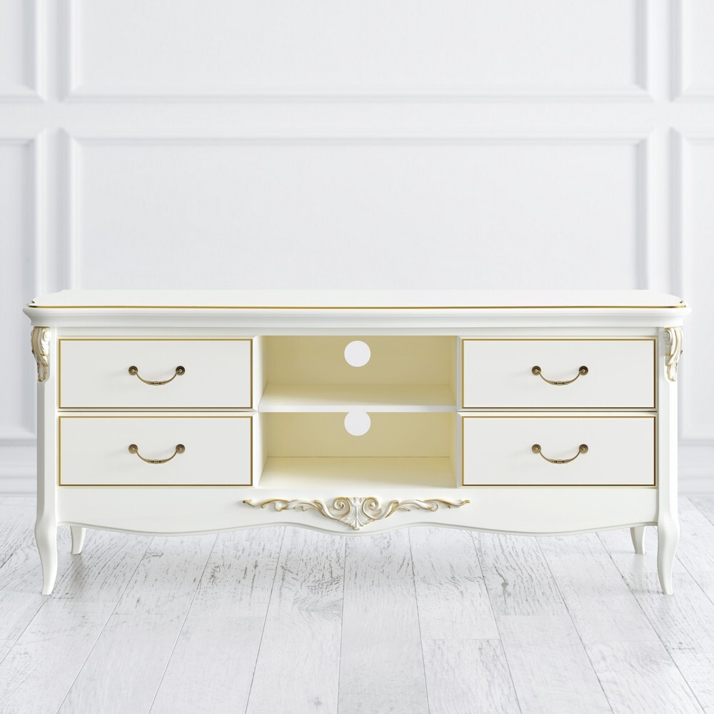 ТВ тумба в стиле «прованс» удачно впишется в роскошный интерьер гостиной или даже спальни. Большая столешница позволит разместить современный широкоформатный телевизор, а для аудиосистемы или спутникового ресивера есть специальные отделения. Эффектный внешний вид подчеркивает сложный декор, а золотая патина придает тумбе черты аристократической роскоши и элегантность. Сборка не требуется.