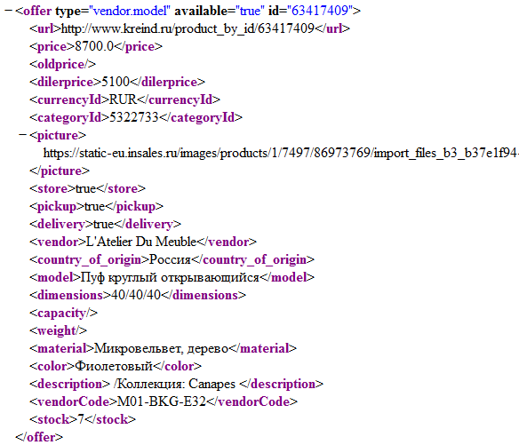 Пример разбора одного из элементов XML файла выгрузки <price> - розничная цена (также цена после скидки) Более подробно узнать об этом формате можно в спецификации по ссылке. |